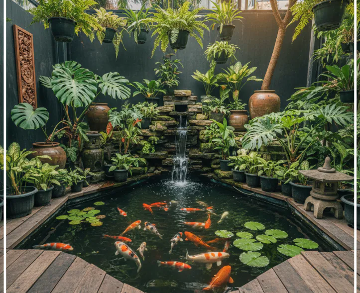 Filter, pompa, hingga tanaman hias dapat ditambahkan untuk mempercantik sekaligus menjaga kualitas air. Suara air terjun kecil juga bisa menjadi elemen penenang.